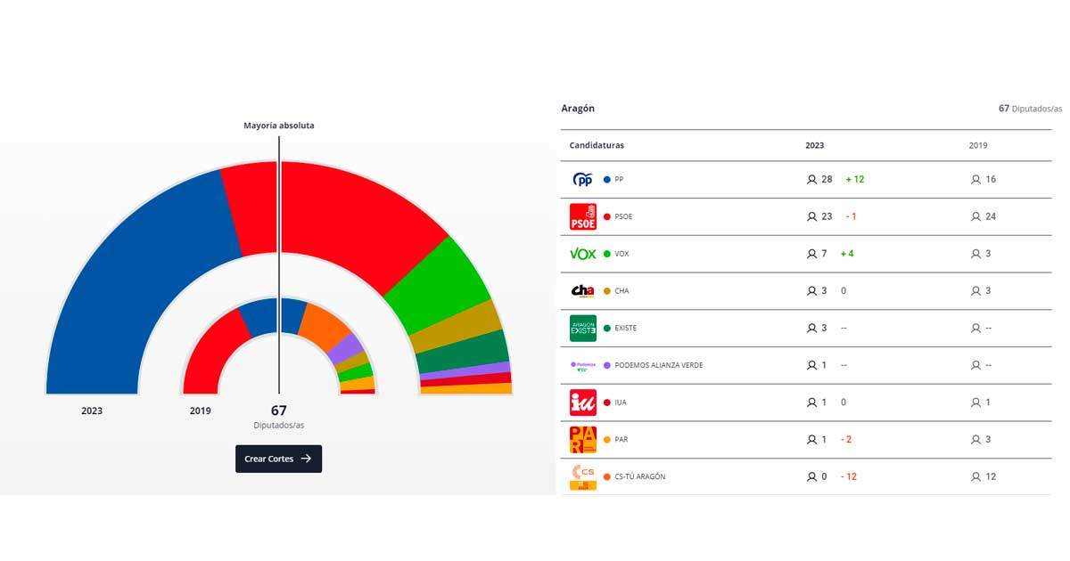 La conformación del Parlamento de Aragón se completa con la irrupción de Aragón Existe con 3 escaños y la entrada de Podemos Alianza Verde con 1 escaño.